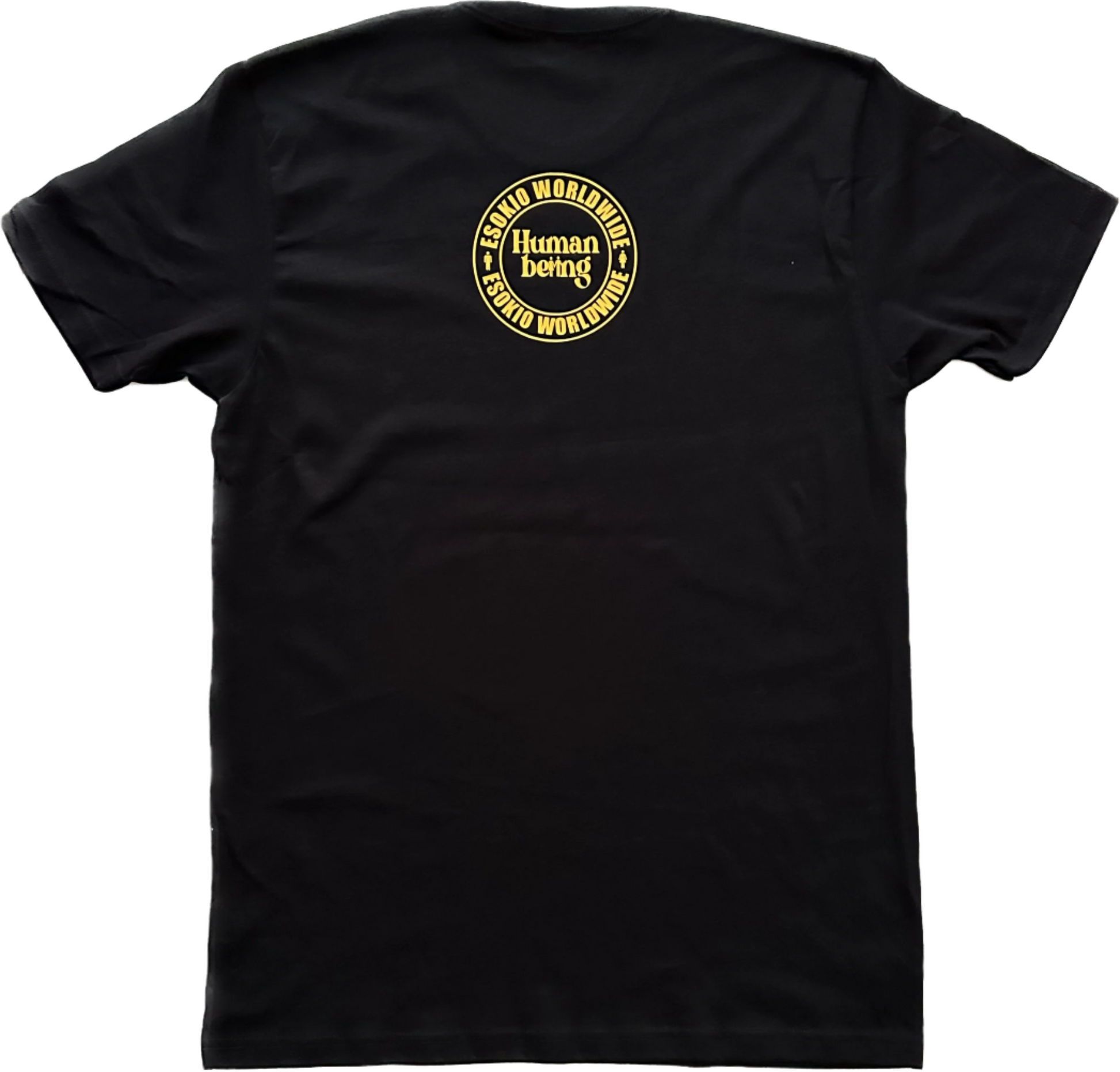 HUMAN BEING Black Premium Tee with Yellow Design. 100% Combed Cotton. Wash in cold water hang or lay flat to dry.