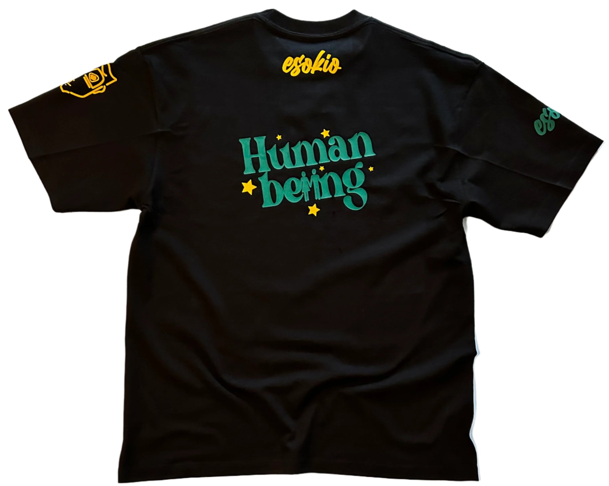 HUMAN BEING Black Premium Tee with Gold and Green Design. 100% Cotton. Wash in cold water hang or lay flat to dry.