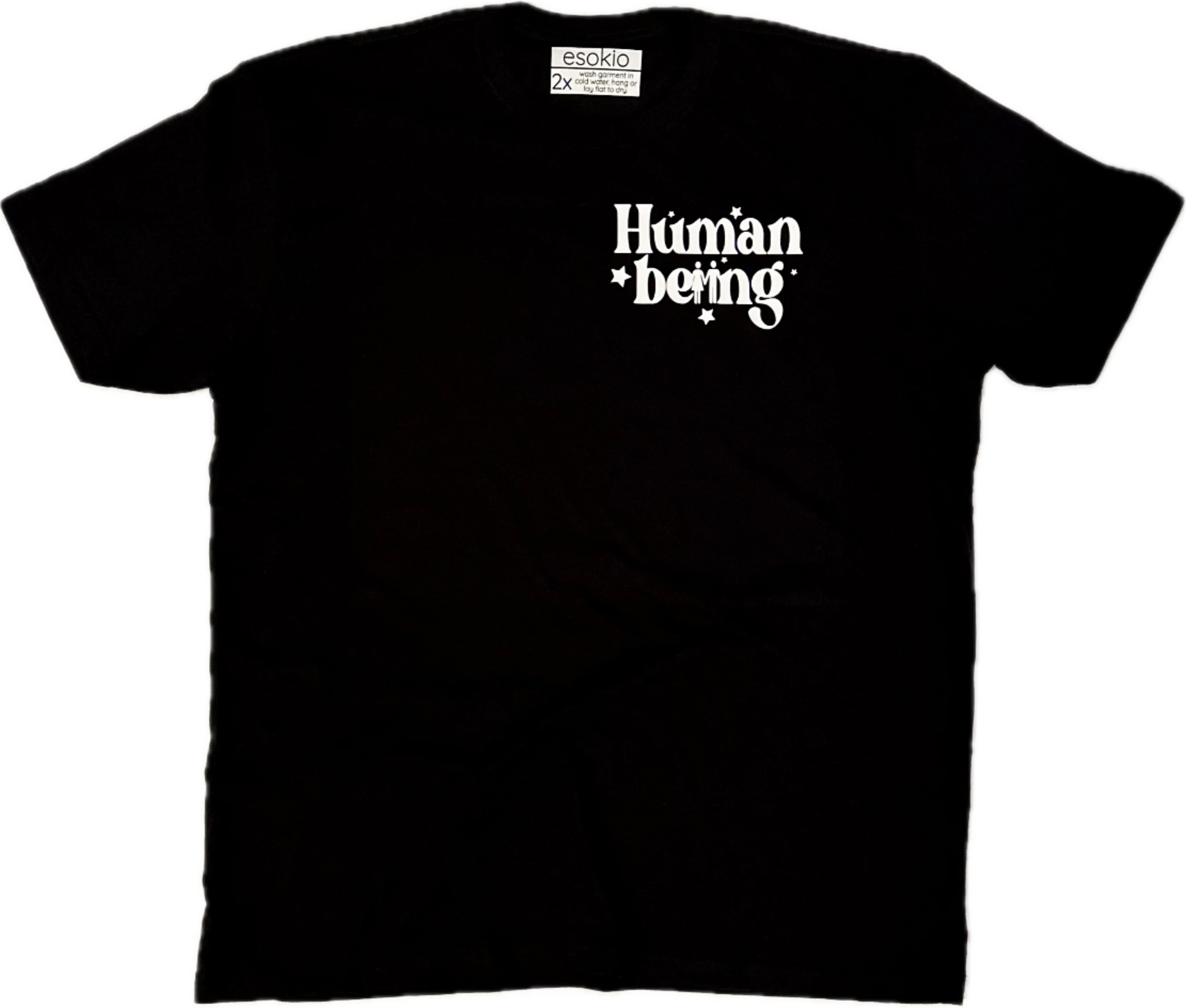 HUMAN BEING Black Premium Tee with White Design. 100% Combed Cotton. Wash in cold water hang or lay flat to dry.